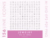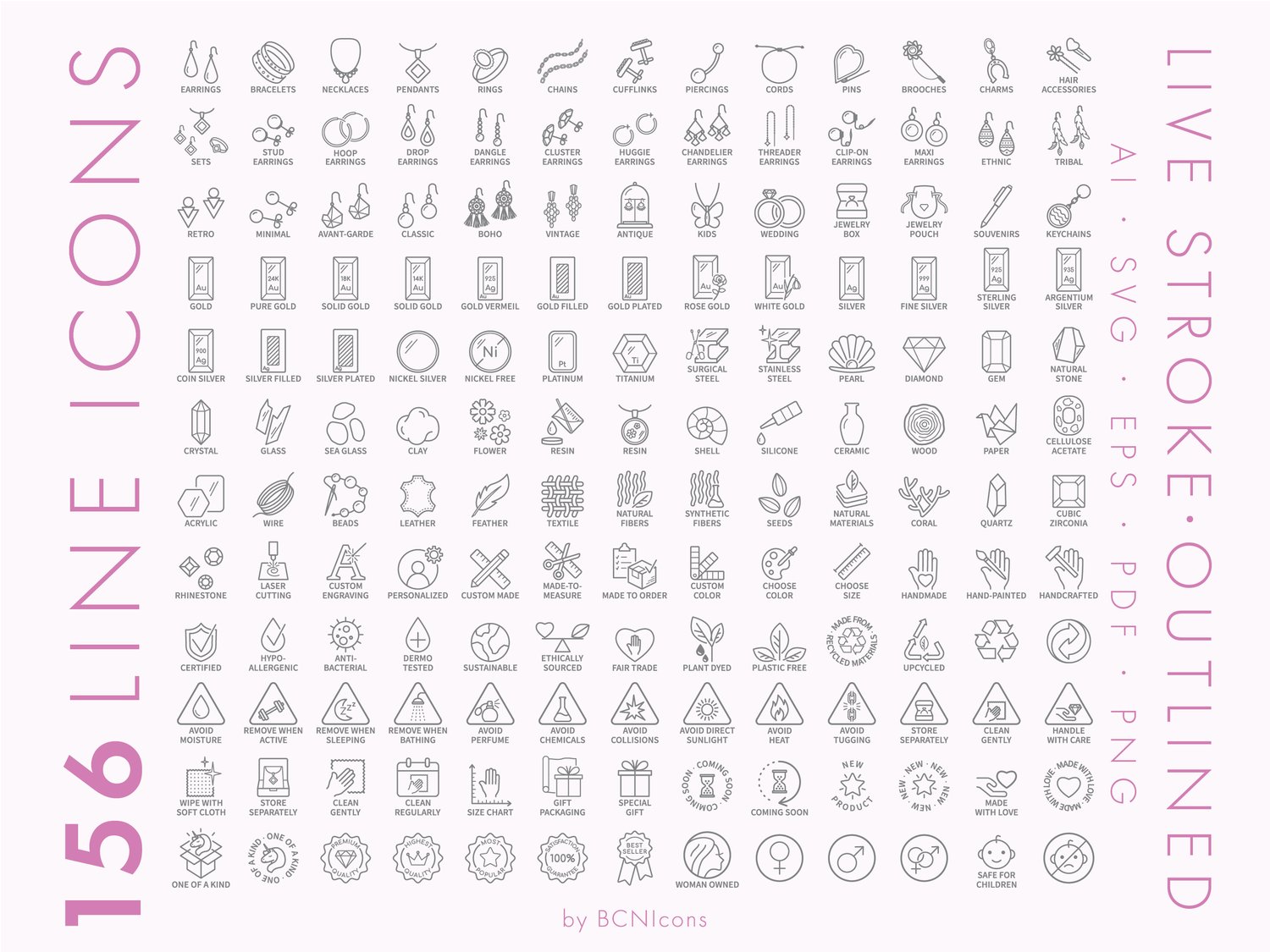 Elegant and minimalist jewelry icons bundle that contains 312 (156 live stroke + 156 outlined) symbols including earrings icons, bracelet icon, necklace and pendant icons, gold and silver icons, rose gold and gold plated icons, chains and cords icons, jewelry care icons, natural stone icon, pearl and diamond icons, resin and clay icons, one of a kind icon, custom made icons, custom engraving icon, handmade icon and gift packaging icon.