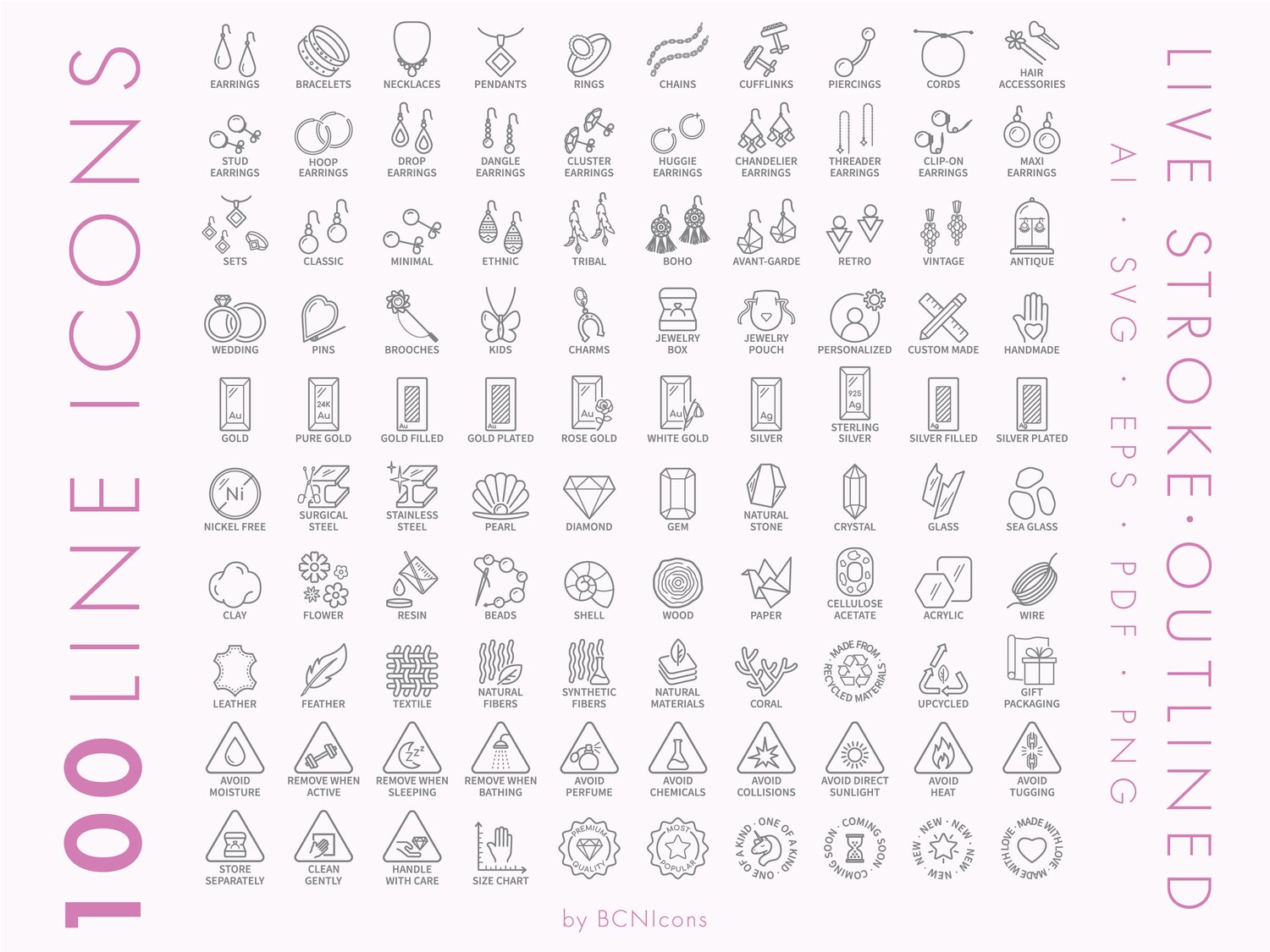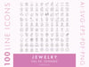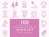 Elegant and minimalist jewelry icons bundle that contains 200 (100 live stroke + 100 outlined) symbols including earrings icons, bracelet icon, necklace and pendant icons, gold and silver icons, rose gold and gold plated icons, chains and cords icons, jewelry care icons, natural stone icon, pearl and diamond icons, resin and clay icons, one of a kind icon, handmade icon and gift packaging icon.