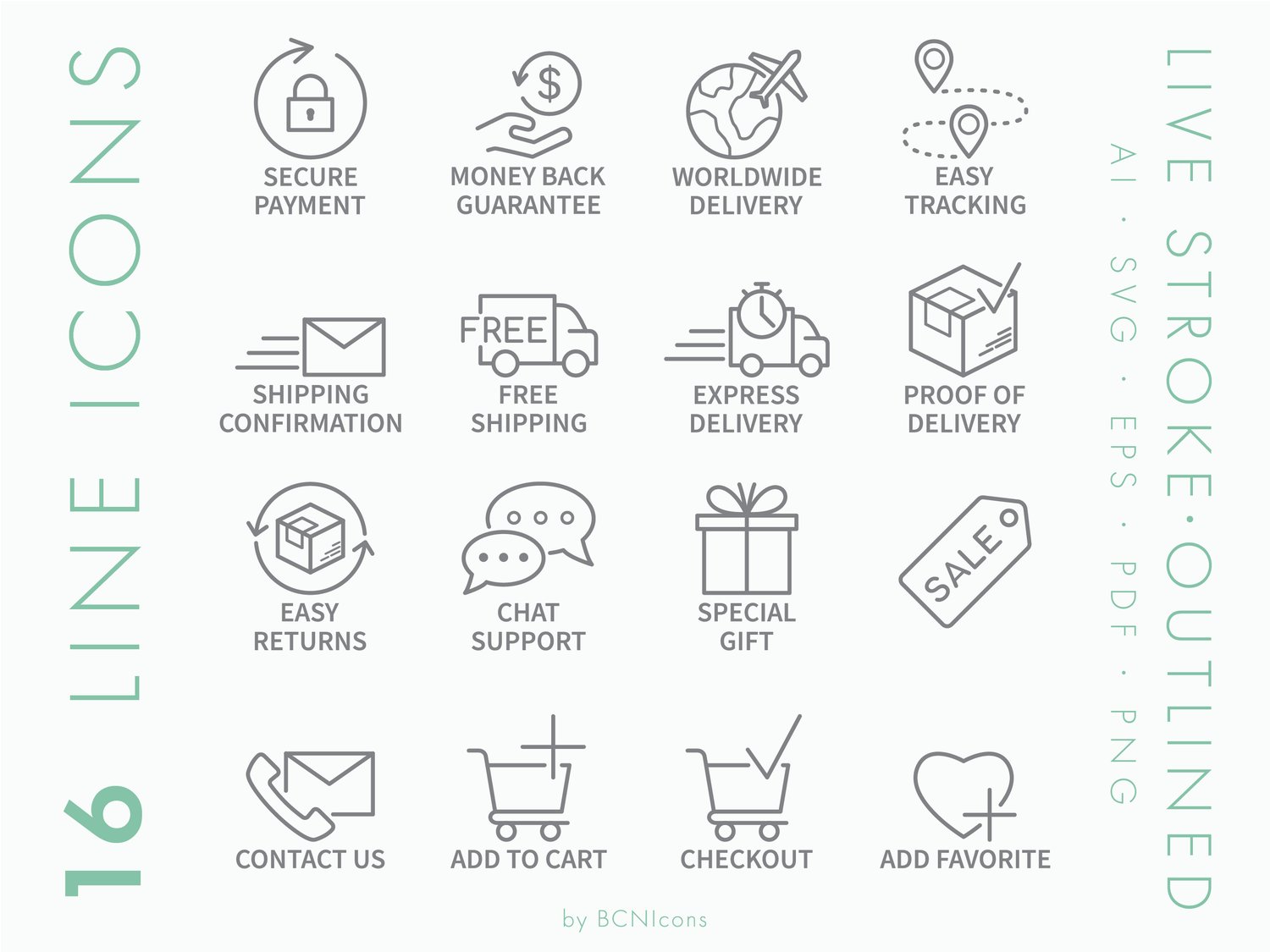 An instant download of a ZIP folder contains icons in default black color in the following formats:16 LIVE STROKE ICONS