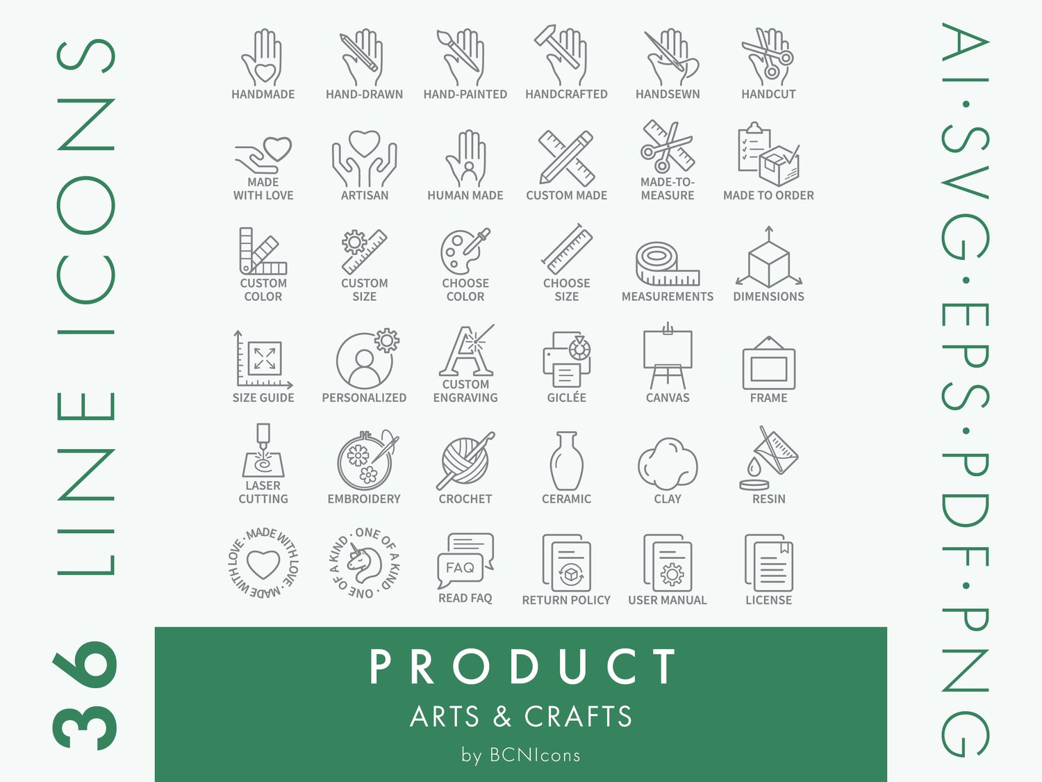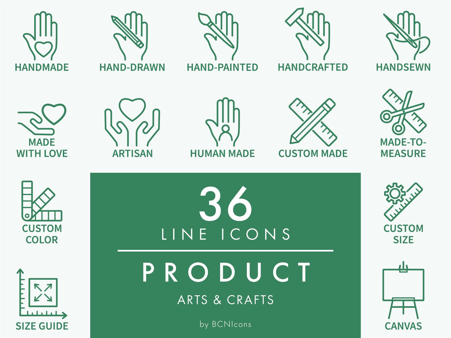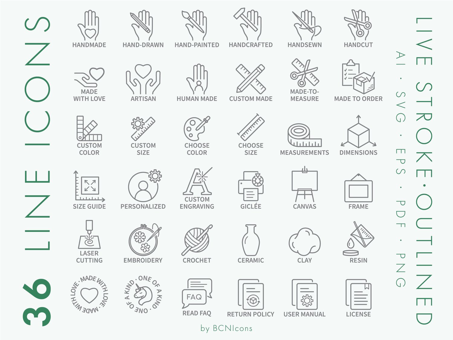 Elegant and minimalist business features icons bundle that contains 72 (36 live stroke + 36 outline) symbols including instant handmade, hand painted, hand crafted, hand drawn, artisanal, custom engraving, laser cutting, canvas, giclee, ceramic, human made and others.